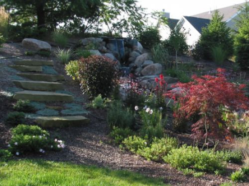 The existing site was wide open with a hill at the back facing their home. The solution was to build a curved sandstone retaining wall and patio into the side of the hill for privacy and relaxation.