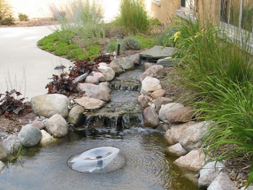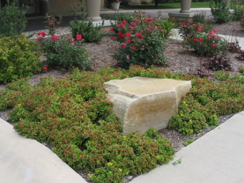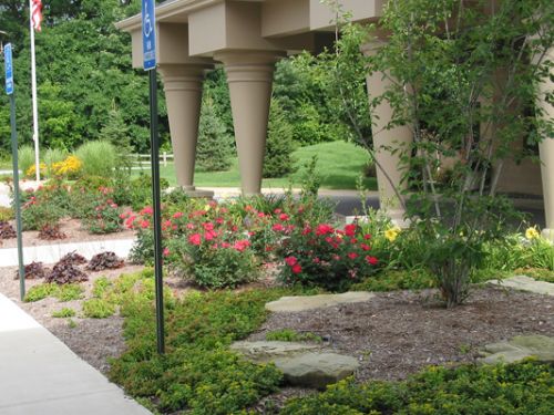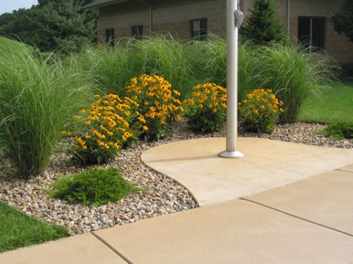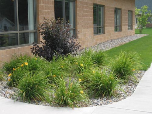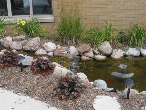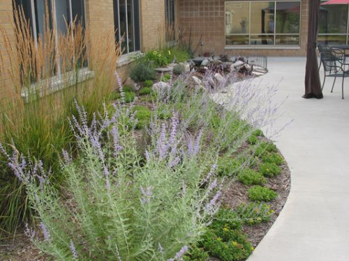 A water feature and bench were placed in a peaceful spot for quiet time. Grasses, perennials and flowering shrubs flank the sign and front walk to create an inviting welcome.